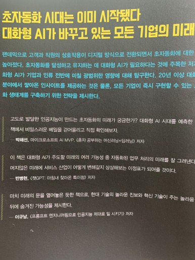 이 책은 디지털 자동화와 관련하여 앞으로 다가올 미래에 대한 인사이트를 제공할 뿐만 아니라 대화형 AI를 지금 바로 활용하는 방법에 대한 실용적인 지침을 제공해주는데요.
