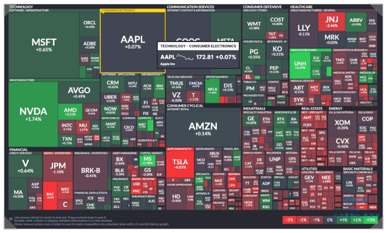 빅테크의 하락이 보이네요. 테슬라가 5.59%로 가장 많이 하락했으며, 테슬라 직원 10% 해고 소식으로 약세를 띄고 있습니다.
