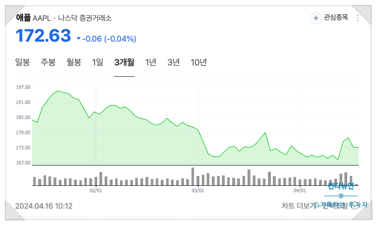 애플은 중국 시장이 미국, 유럽 다음으로 크지만, 글로벌 판매량 13% 감소하며 어려운 시기를 겪고 있고, 애플 주가는 하락세를 보이고 있습니다.